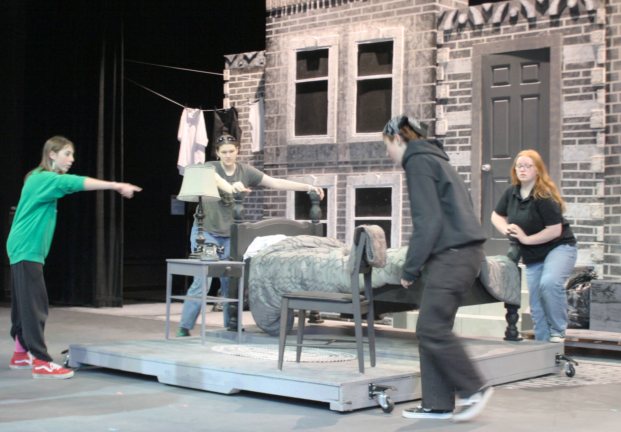 Technical director Otter Cannon (center right) and crew members Jasper Gustafson (left), Vija Gilvydis (rear left) and Becca Corns (right) demonstrate a practical effect with a rotating bedroom on the set built by BHS students for ‘The Outsiders.’