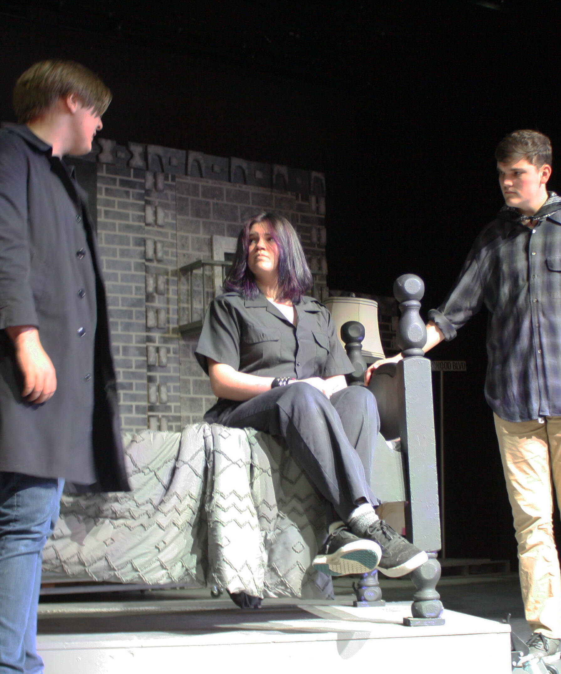 Students design the set and costumes for the play. Otter Cannon, technical director, said that while advisor Aimee Triana gave the crew the idea to make the sets in grayscale, most of the other design choices were up to the student team. “We have the opportunity to voice our ideas, and she teaches how to think through the script,” Cannon said. “I’d say I’m most proud of the lights — I programmed them all myself.”