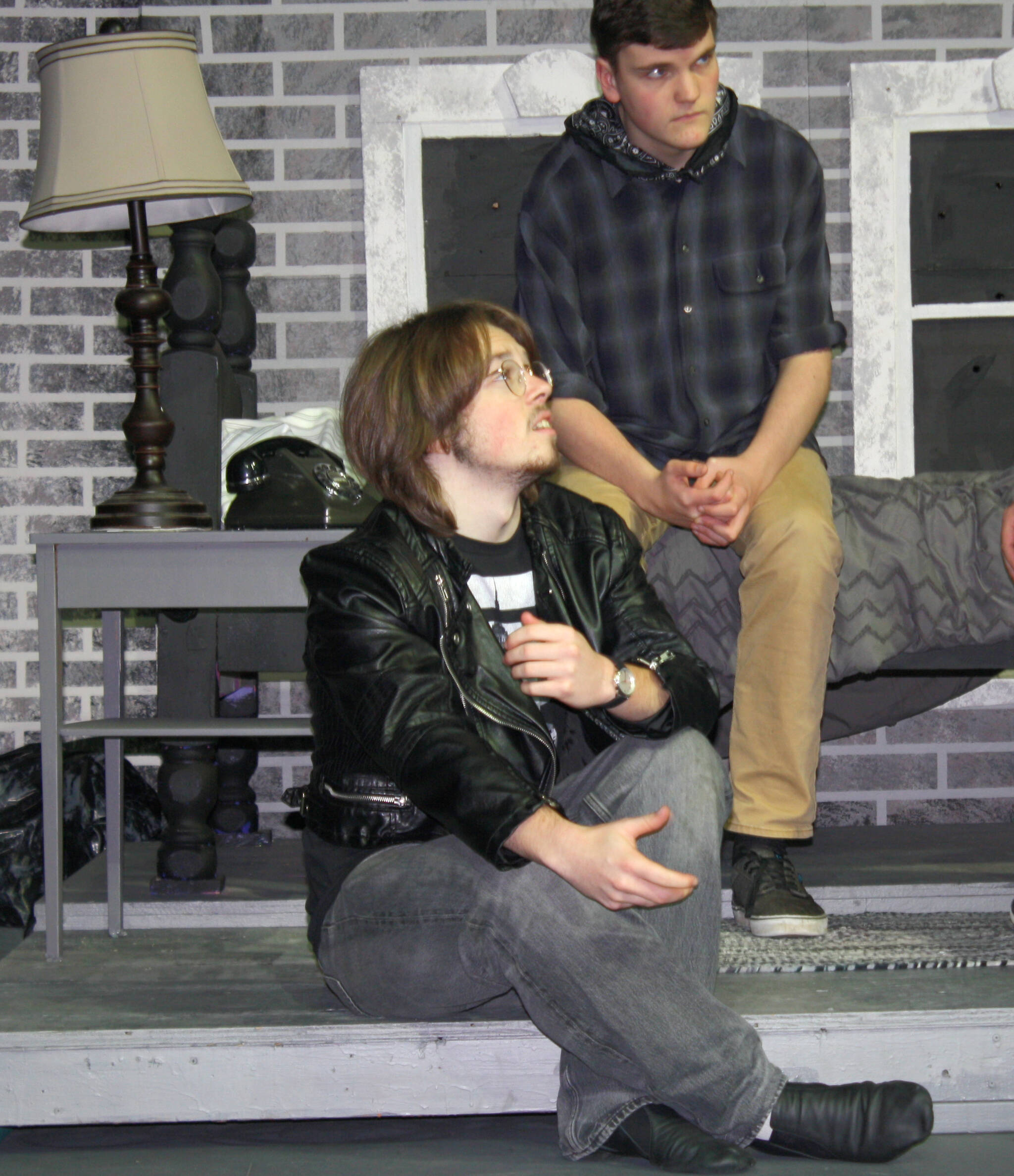 ‘Greasers” Darry (Liam Hayes, left), Ponyboy (Lily Terp, center) and Sodapop (Camden Diercks, right) discuss a friend suffering from an illness.