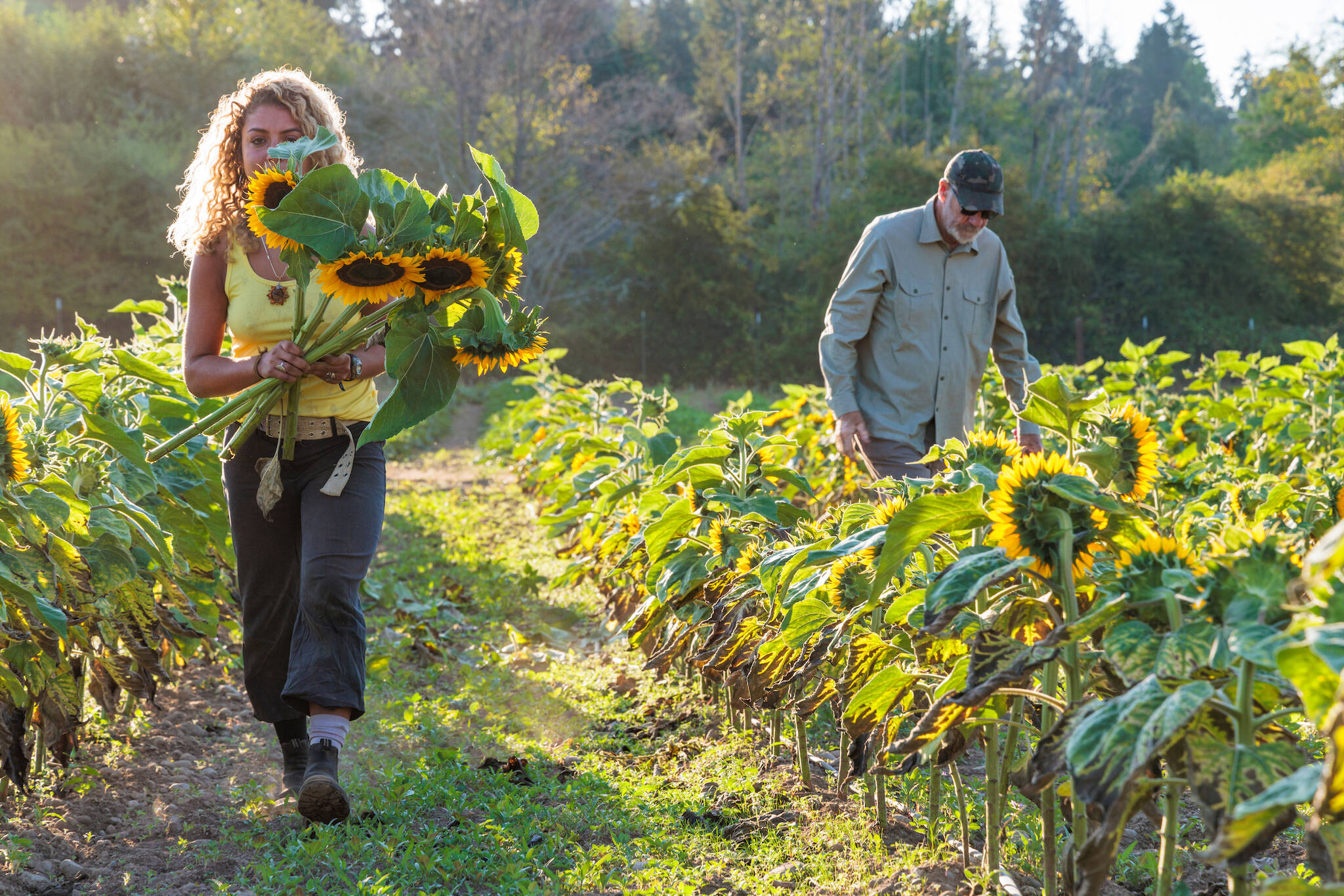 MiddleField Farm manager Brian MacWhorter walks through a field of sunflowers while an intern takes cut flowers from the field.