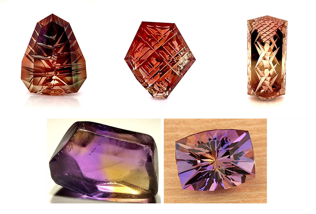 Top left: Fantasy cutting tri color Oregon Sunstone by Aaron Sangeneto. Top middle: Fantasy cutting bright orange and red Oregon Sunstone by David Tyrpak. Top right: Fantasy cutting by Smithsonian Award Winning lapidary Artist Ryan Joseph Anderson. Bottom: A gem rough brought to life by Troy Richardson.