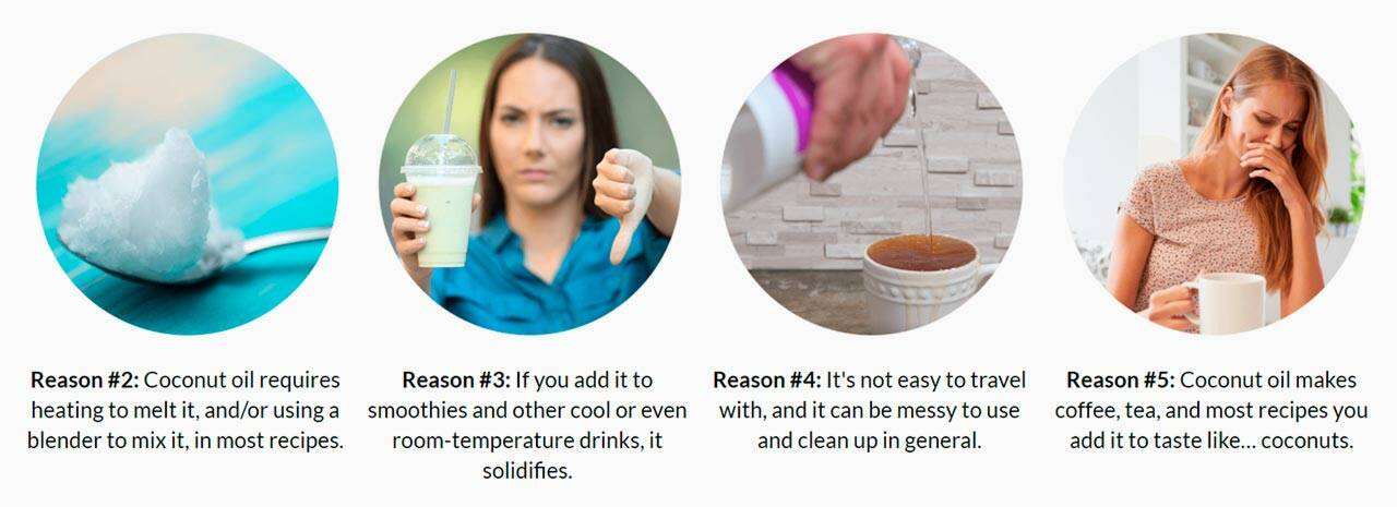Coconut Oil supplements may spill and can cause a disaster. Also, coconut oil solidifies at room temperature, making it difficult to add it to smoothies or shakes. Coconut oil has a strong taste, and if it is mixed with any drink, the drink starts smelling like coconut.