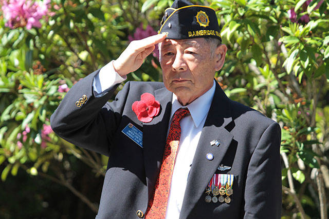 The post and members of the community lay a wreath and flowers at the base of the Veterans Memorial, and Post Adjutant Bill Beck then read the names of deceased Bainbridge veterans before Chaplain Tom Vargas shared a remembrance prayer.