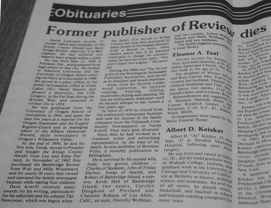 David and Verda Averill bought the paper from the Woodwards in 1962 and owned it until 1988. They actually bought the Kitsap County Herald in Poulsbo earlier in 1959.
