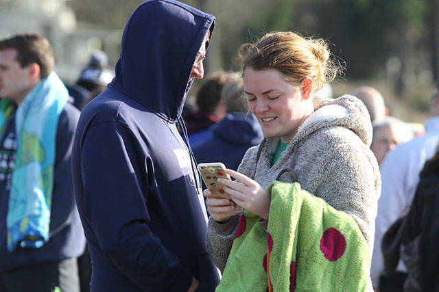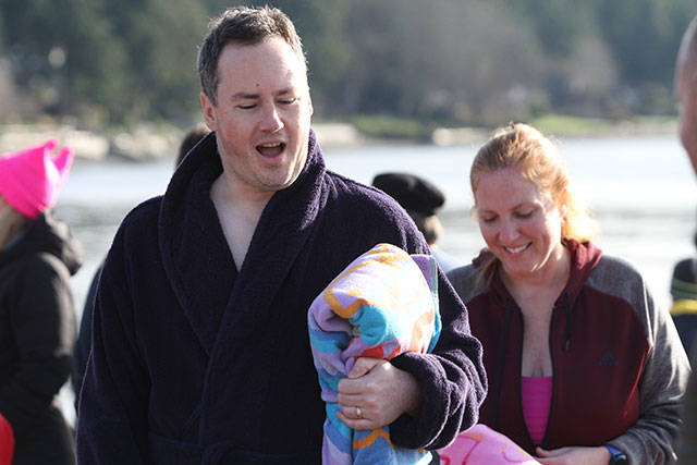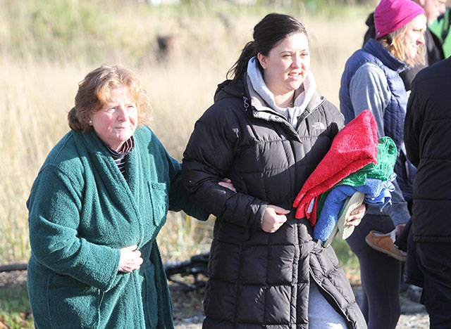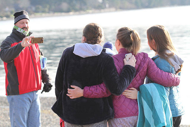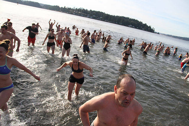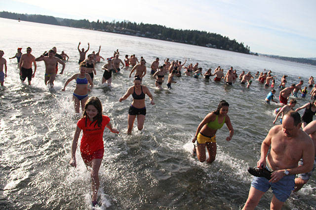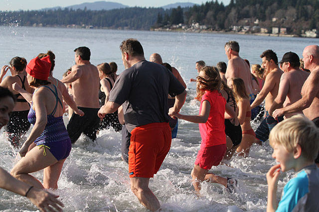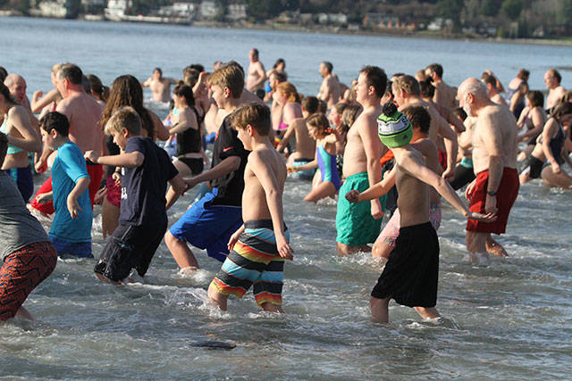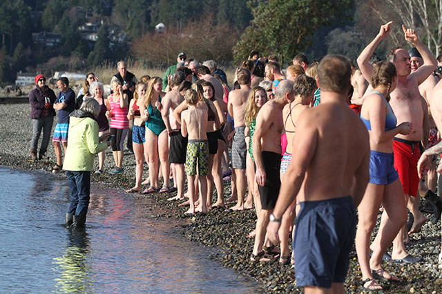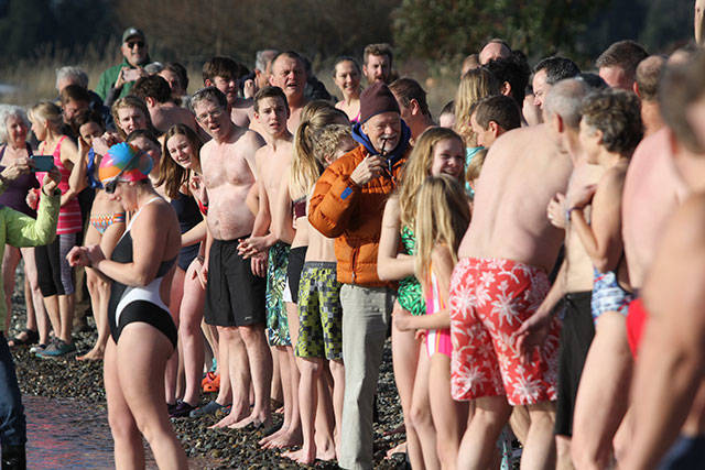 A crowd of nearly 300 jammed Lytle Beach Monday and the bravest among them raced into the frigid waters of Puget Sound for the “polar bear” plunge on the first day of 2018.