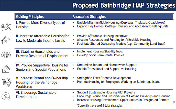 Associated strategies include things like: more tiny homes and triplexes; affordable housing incentives; shared ownership; transitional and supportive housing; tenant and homeowner support; ferry-oriented development; reuse of existing buildings; and more houses in designated centers.