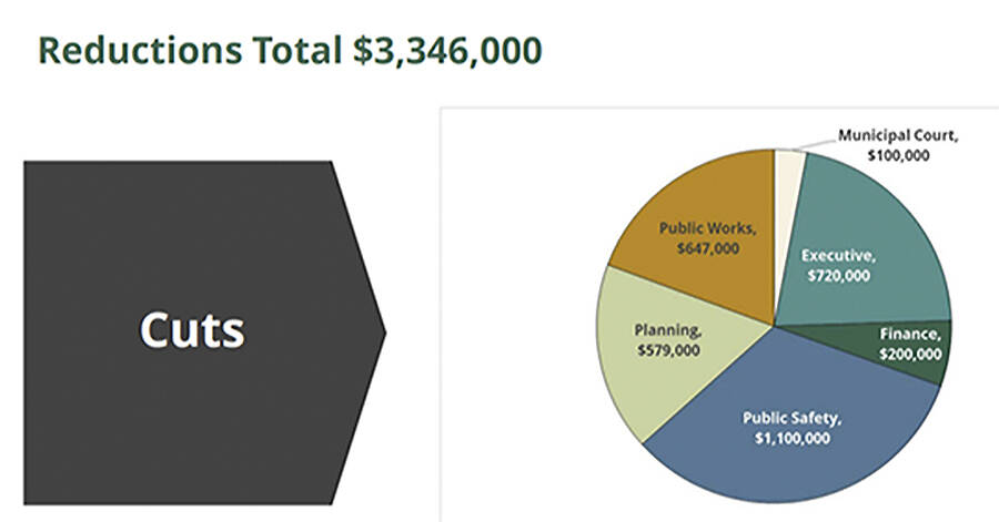 Each department is facing cuts proportionate to the overall budget totalling $2.77 million: Public safety $1.1 million; executive $720,000; Public Works $647,000; and finance $200,000.