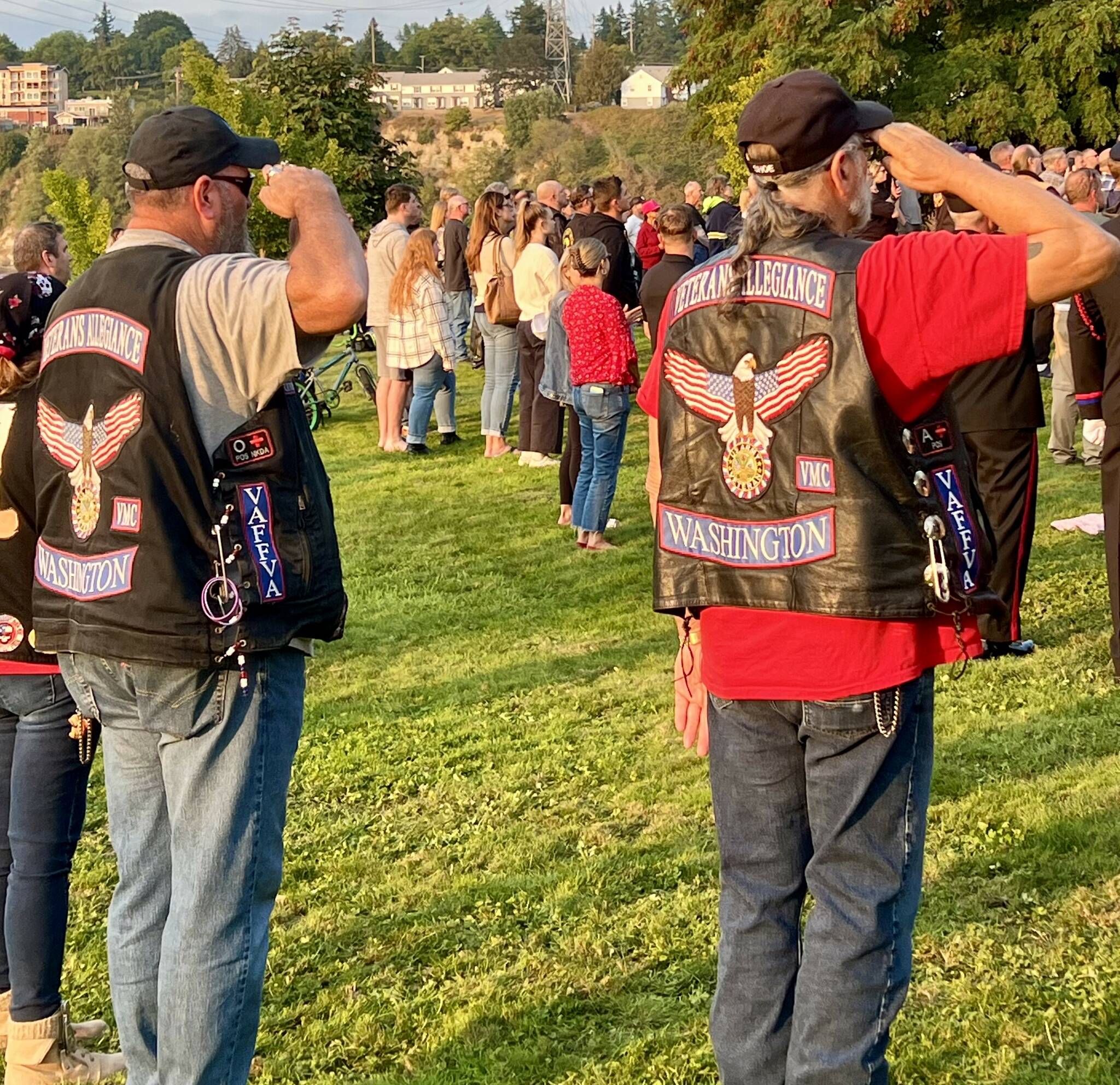 The event began with opening remarks from David Raymond, an original member of the Kitsap 9/11 Memorial Project. The memorial features steel artifacts from the World Trade Center. The Kitsap Firefighters Union Honor Guard presented the colors, followed by the national anthem performed by local musician Kim Hurst.