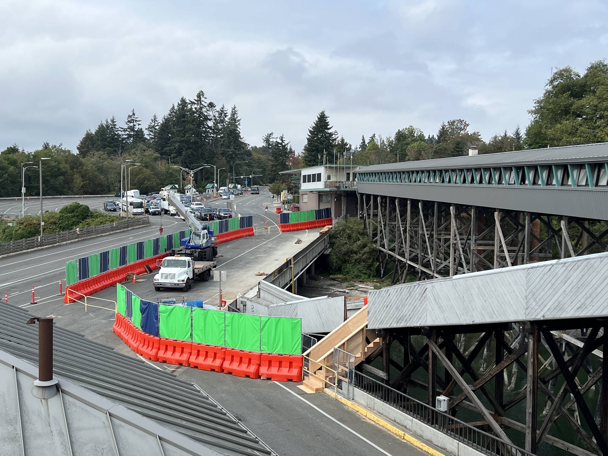 More than a week after a ferry passenger was charged for breaking windows at the Bainbridge terminal, construction crews opened a temporary walkway and began preparations to dismantle the first 100 feet of the overhead walkway.