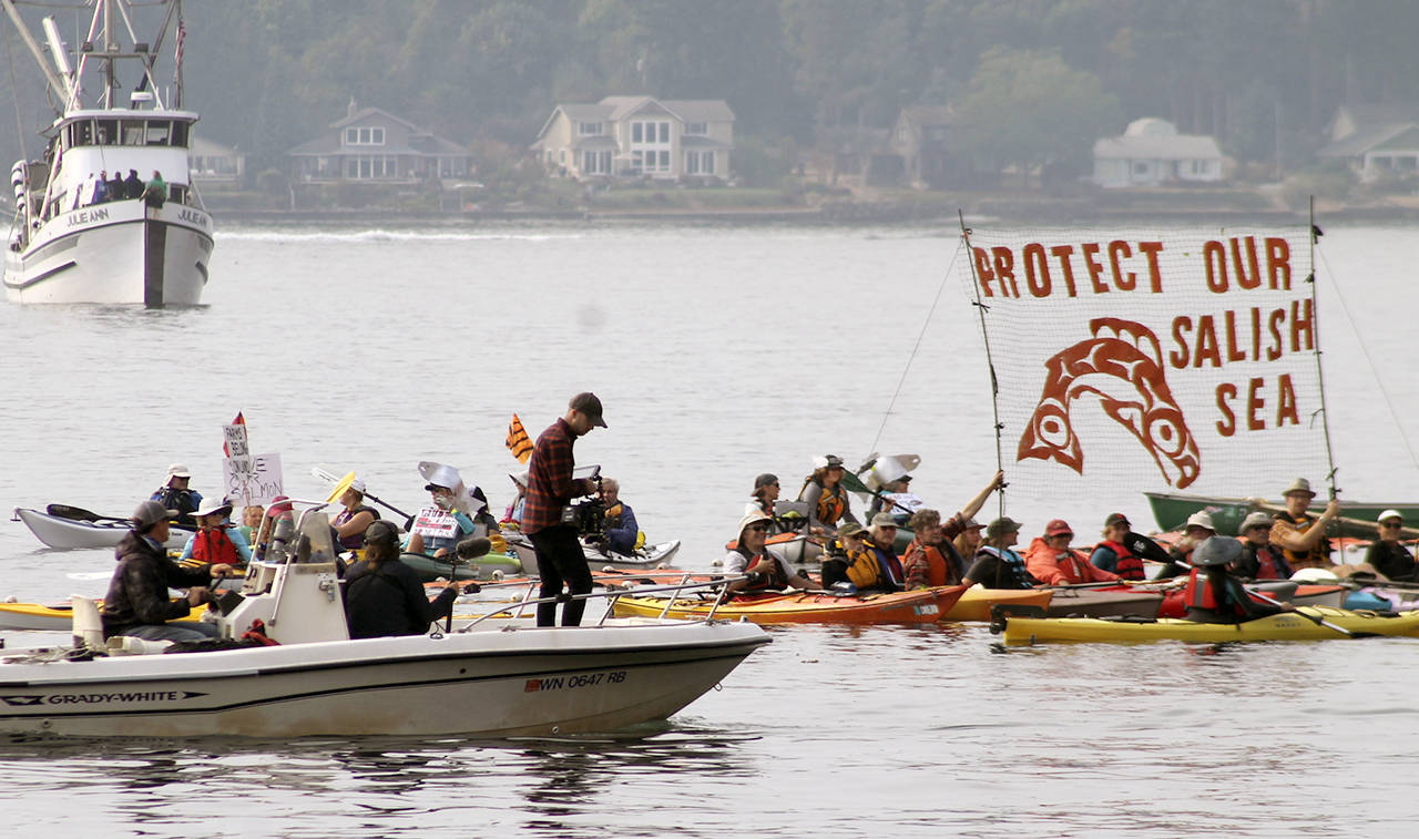 Several kayakers raised a large mesh banner with the outline of a salmon and the words “PROTECT OUR SALISH SEA” in big red letters. A little after 4 p.m., the small boats clustered closer together and protesters began to chant, holler, wave signs and honk air horns as the television camera boat passed by.