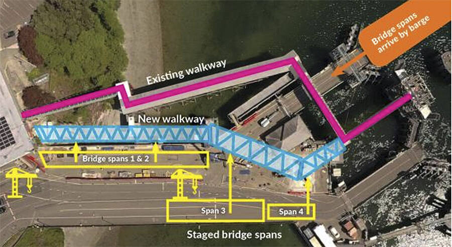 Crews will be using cranes to lift walkway structures into place and affix them to concrete and steel pilings. The four huge structures will come by barge from Tacoma and take up the space usually used for vehicles waiting for the ferry on Bainbridge Island. The largest span is 199 feet long and weighs 45 tons. The existing walkway is over 50 years old and prior to COVID handled 3.2 million passengers a year.