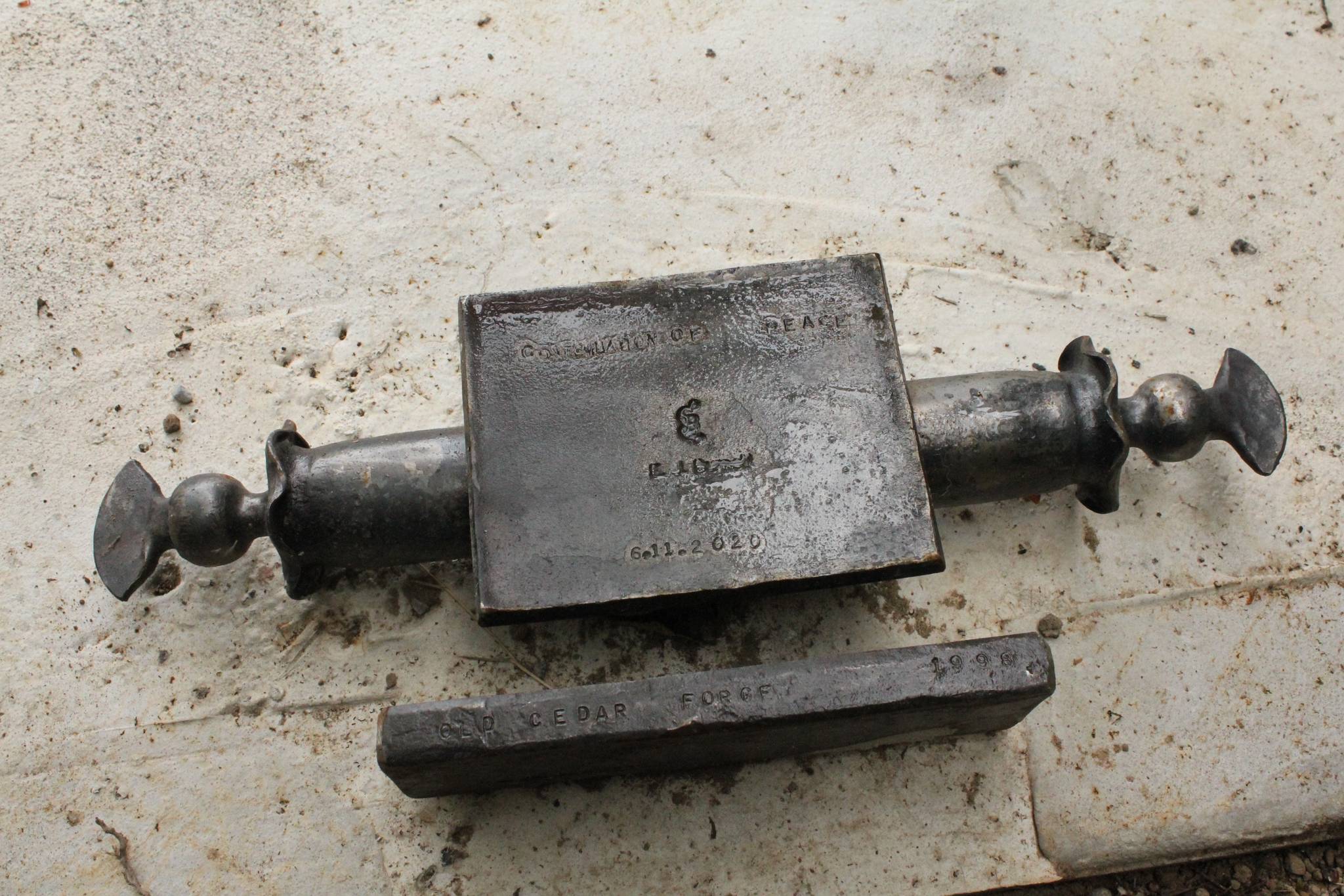 In describing the forms present in “Continuation of Peace” Burnett said he visualized the bird, held in a contained space, rising slowly upward, then finally breaking free of its confines and escaping skyward. At the base of the sculpture rests a scroll, with the words, “Continuation of Peace,” stamped above it. Below the scroll rests another section of wording stamped into the steel: “Old Cedar Forge, 1998.”