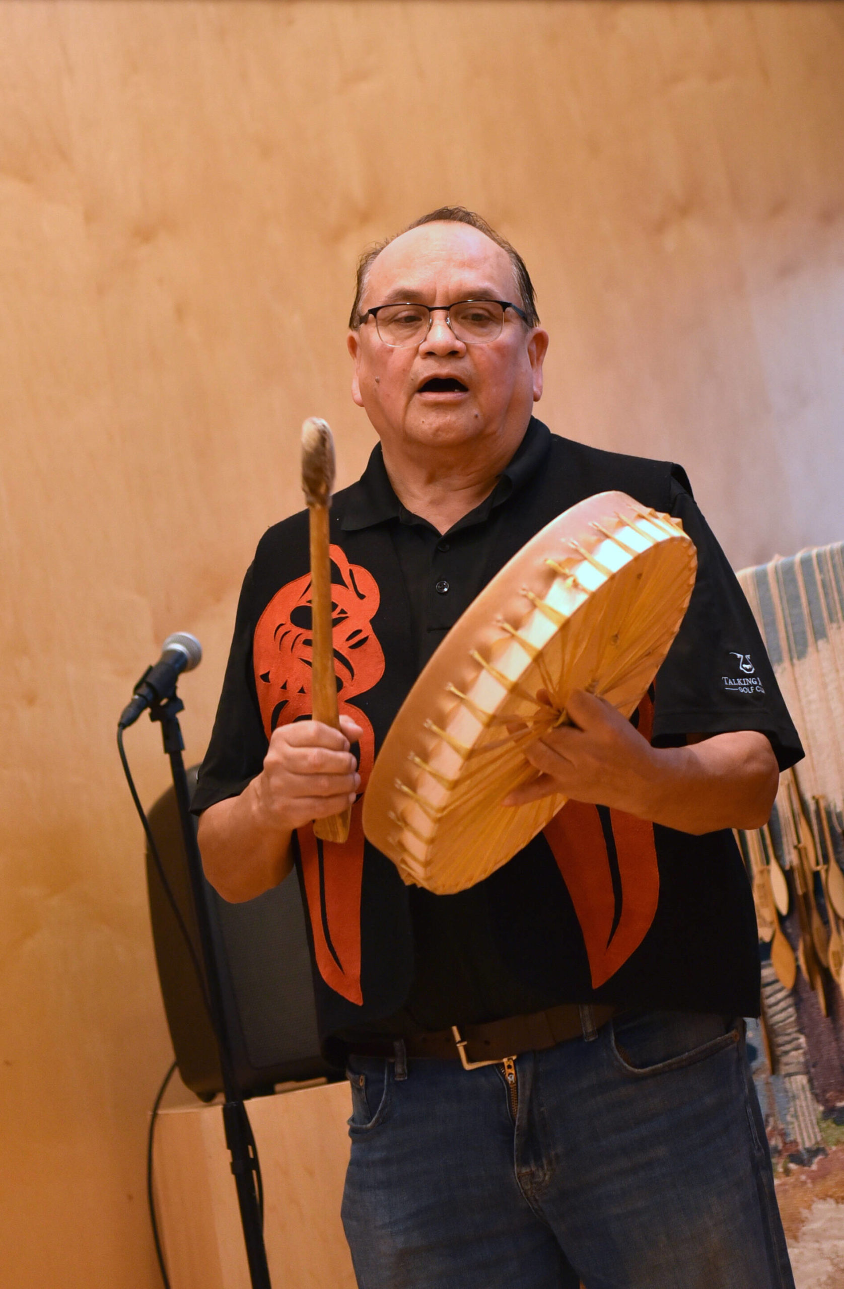 Joseph Martin, executive board chair for the Indipino community, sings an honor song dedicated to the 36 indigenous mothers who were the founders of the Indipino community on Bainbridge.