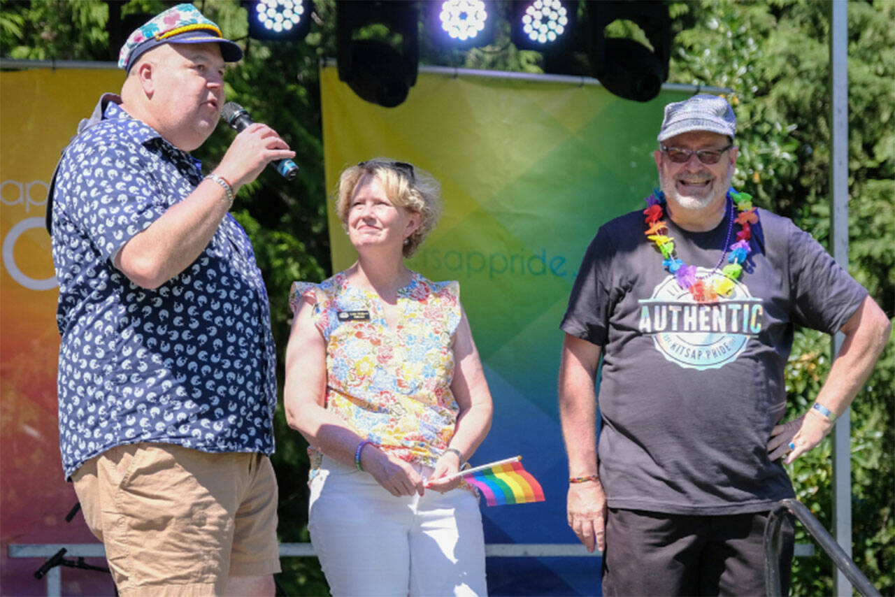 Bremerton City Councilmember Michael Goodnow, left, Kitsap County Commissioner Katie Walters, and Greater Kitsap Chamber of Commerce president David Emmons kick off the Kitsap Pride Festival.