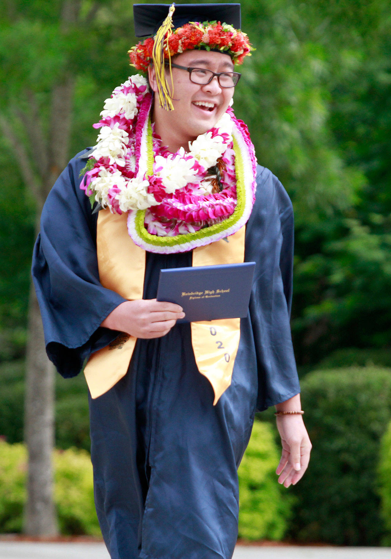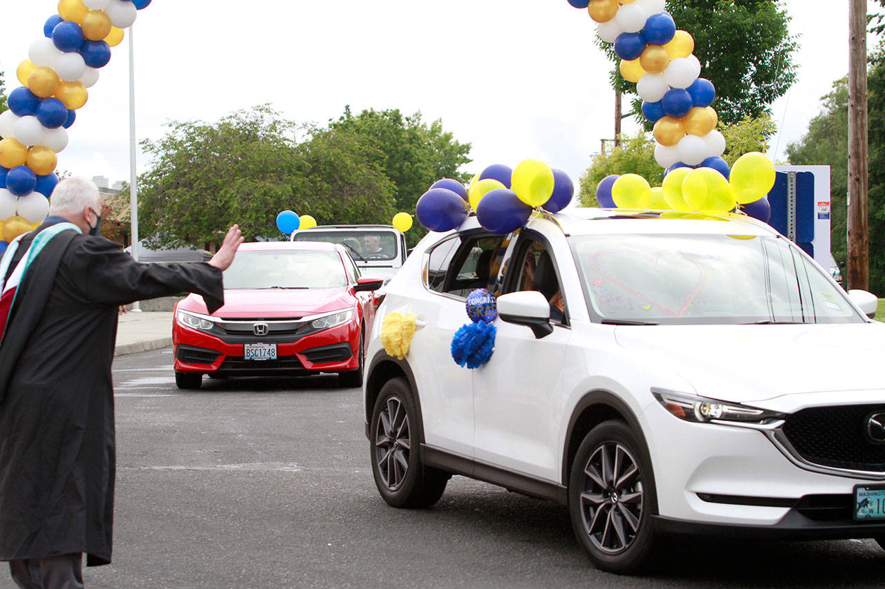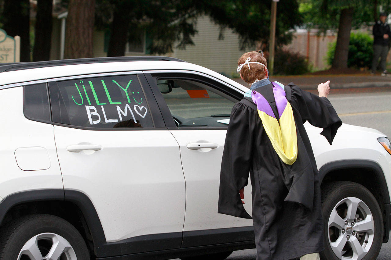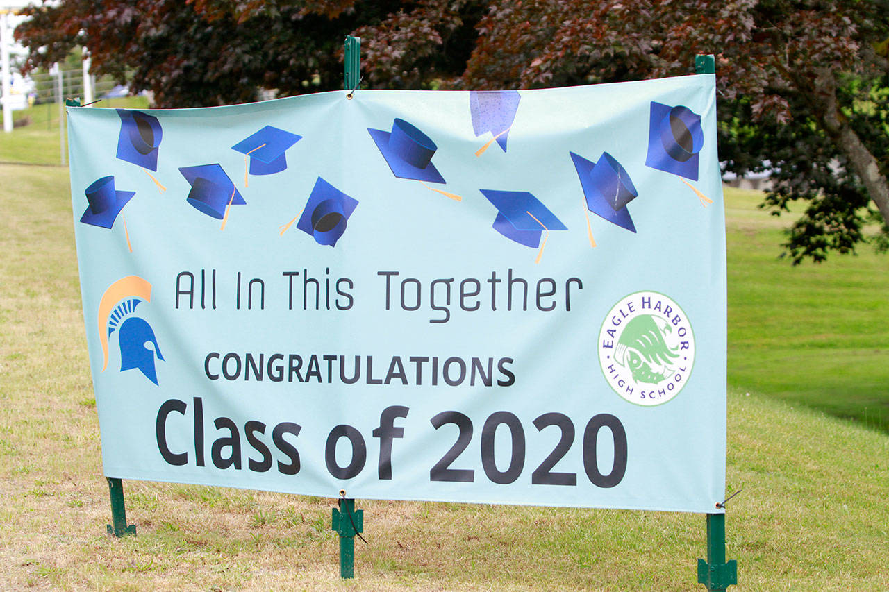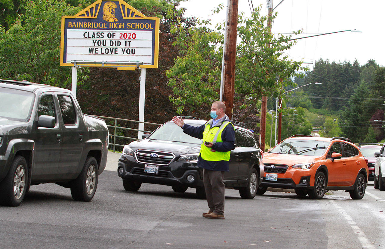 The annual joint Bainbridge and Eagle Harbor high school graduation ceremony, properly modified for current events, returned to the BHS campus Saturday, June 13. Maintaining social distancing and current government guidelines, school officials said, were the reasons for the revised ceremony, which saw students gather in the parking lot of the nearby Bainbridge Island Aquatic Center and drive in small groups to campus.