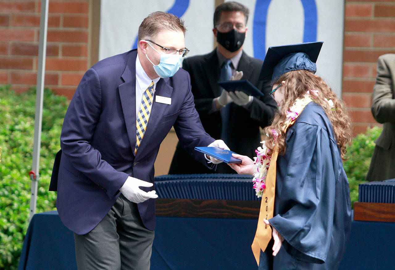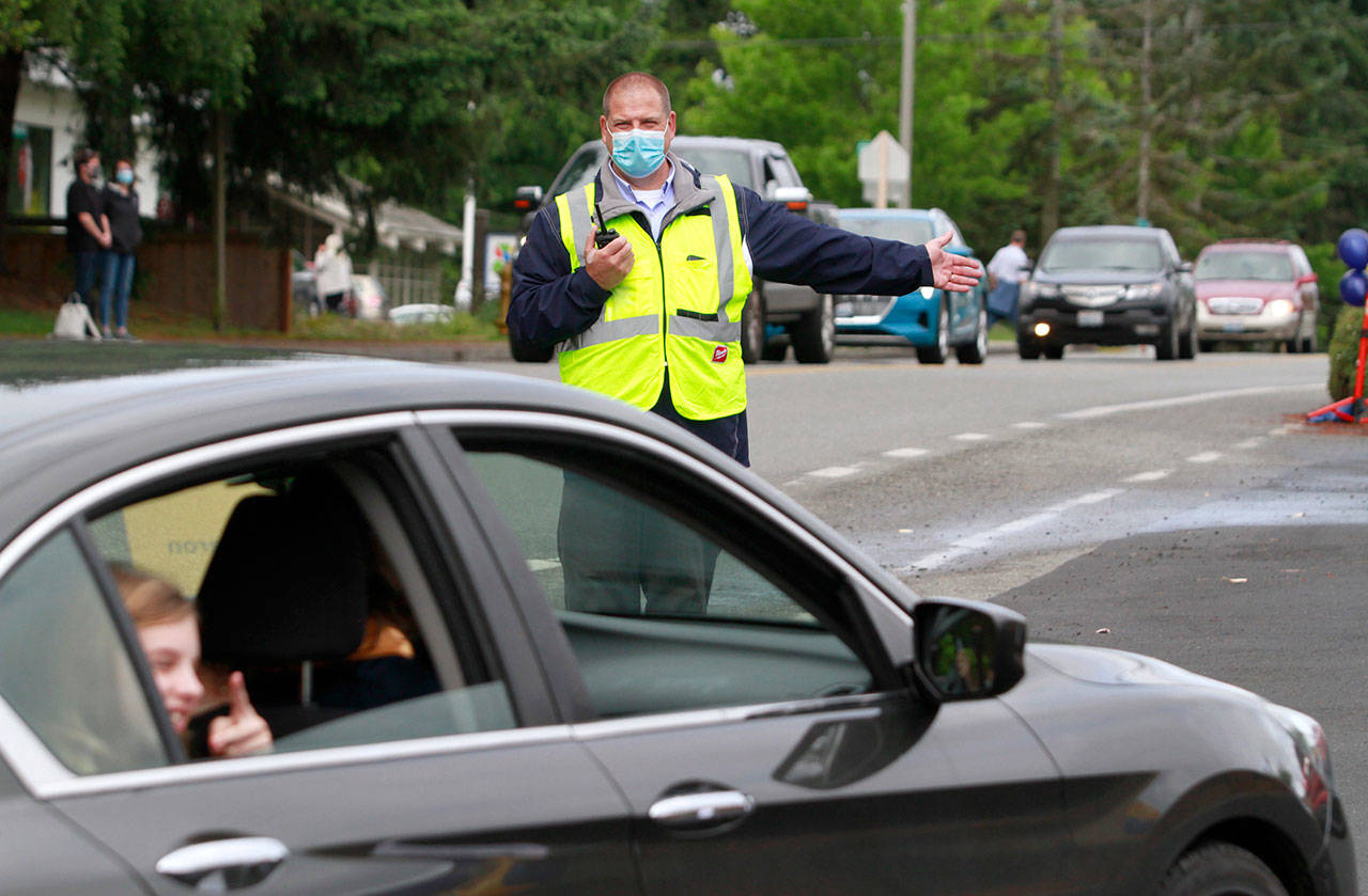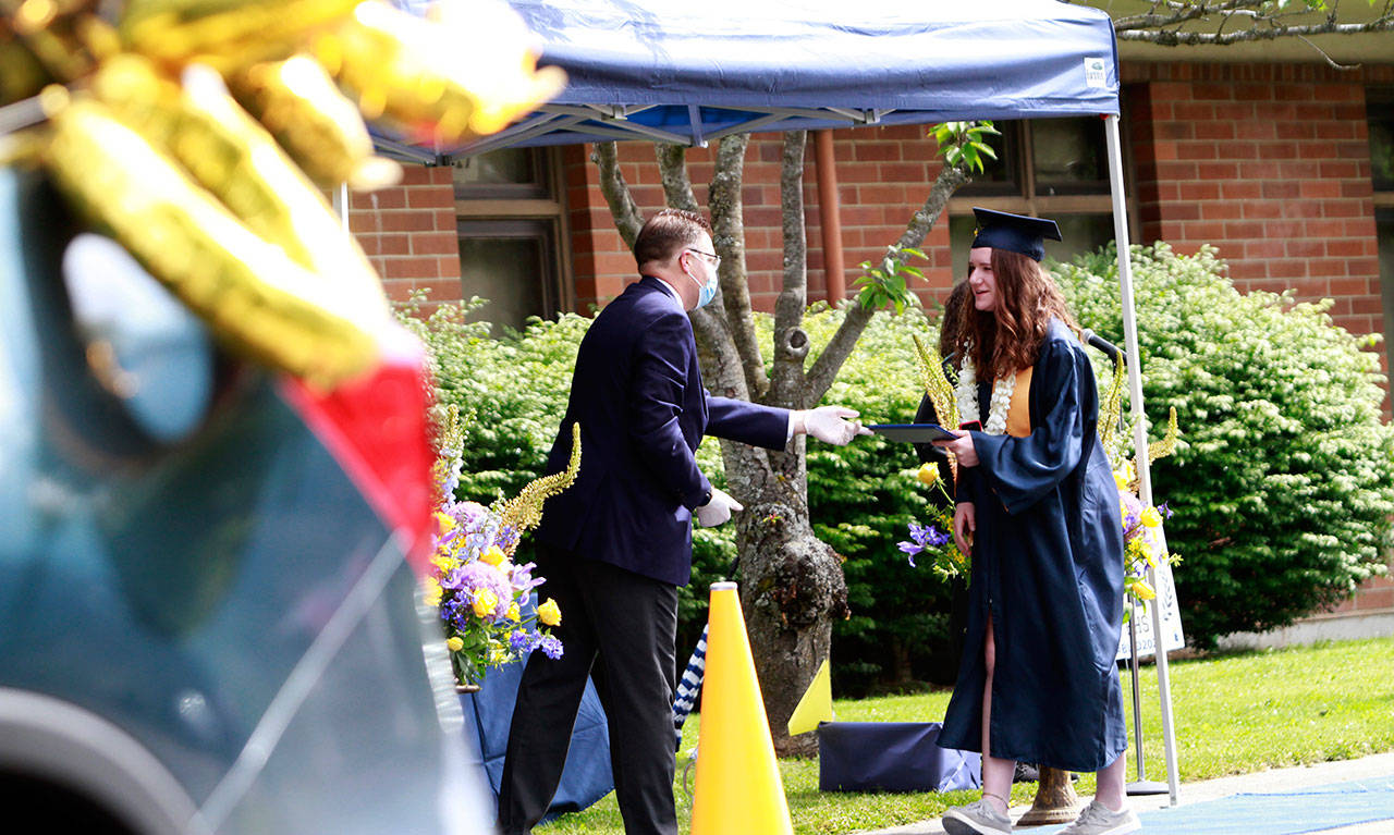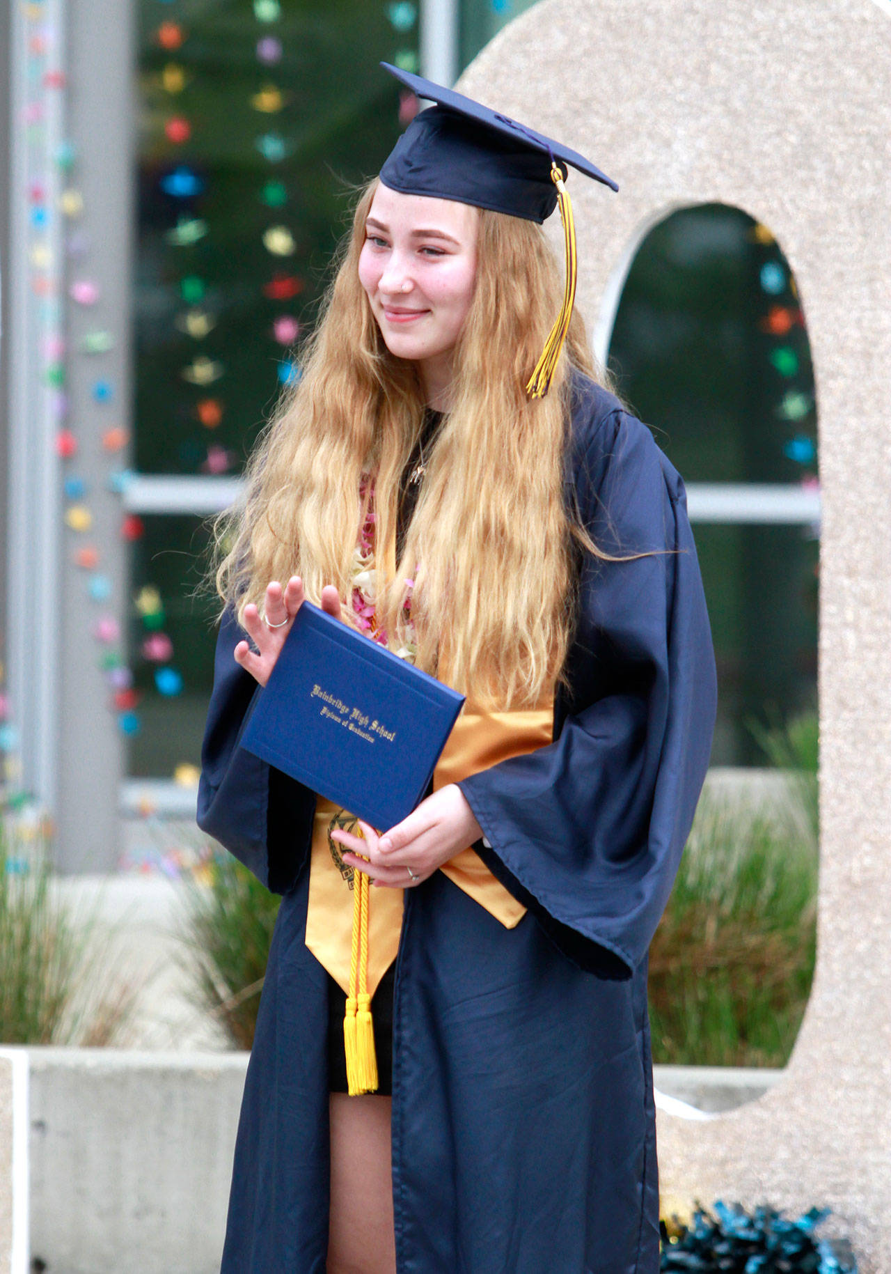 The annual joint Bainbridge and Eagle Harbor high school graduation ceremony, properly modified for current events, returned to the BHS campus Saturday, June 13. Maintaining social distancing and current government guidelines, school officials said, were the reasons for the revised ceremony, which saw students gather in the parking lot of the nearby Bainbridge Island Aquatic Center and drive in small groups to campus.