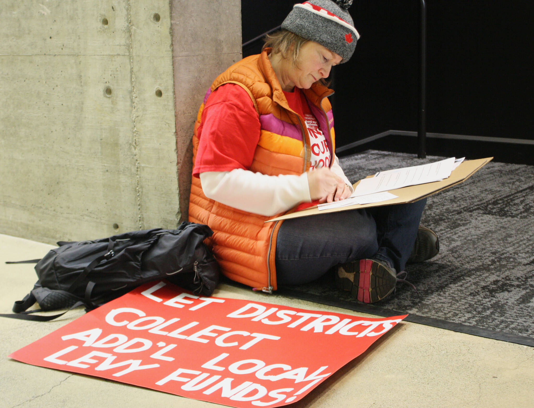 Residents filled every seat in the room; some stood or sat in the stairways, some held young children, some arrived in motorized wheelchairs. While the meeting was not exclusively about public education, it was top of mind for many: around one-third of attendees carried signs referring to the district’s budget and wore red shirts and pins, the symbol of a national grassroots movement by parents and teachers to support public education.