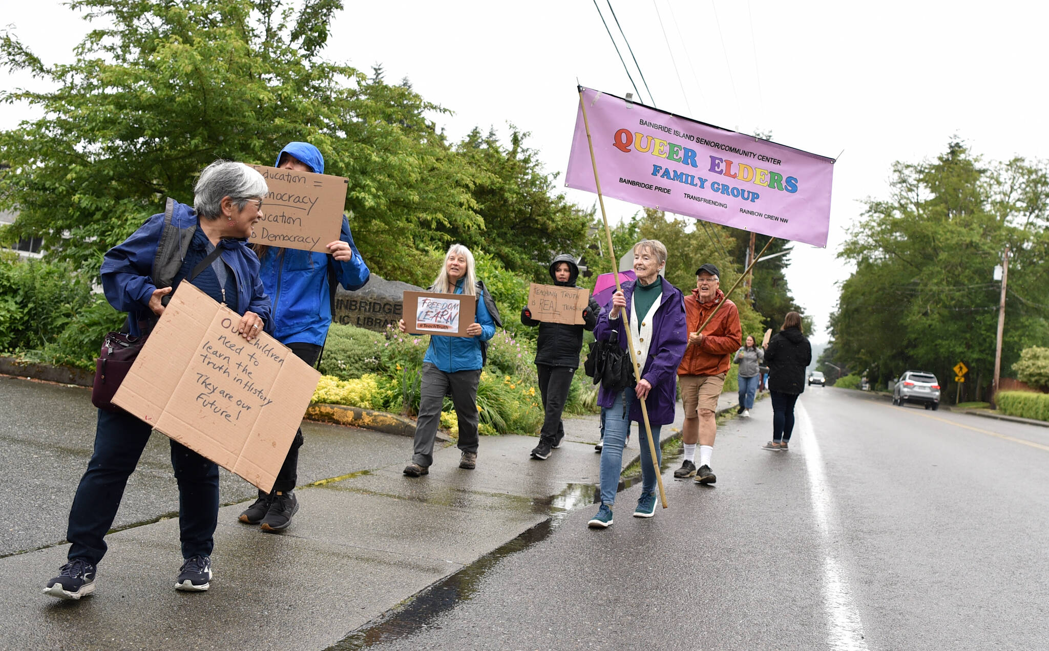 Educator Jing Fong moderated the “Freedom to Learn: What’s at Stake” panel discussion with questions about teaching truth, even when it may be uncomfortable. Attendees gathered with leaders from the Bainbridge Multicultural Advisory Community, H.E.A.L. Together and the Zinn Education Project and marched from the BI Historical Museum to the public library to raise awareness about laws that ban gender-affirming care for trans-youth and books addressing LGBTQIA+ issues.
