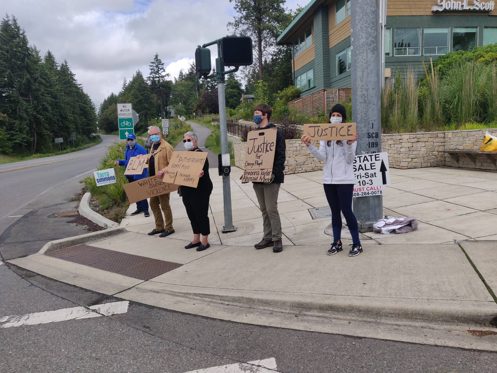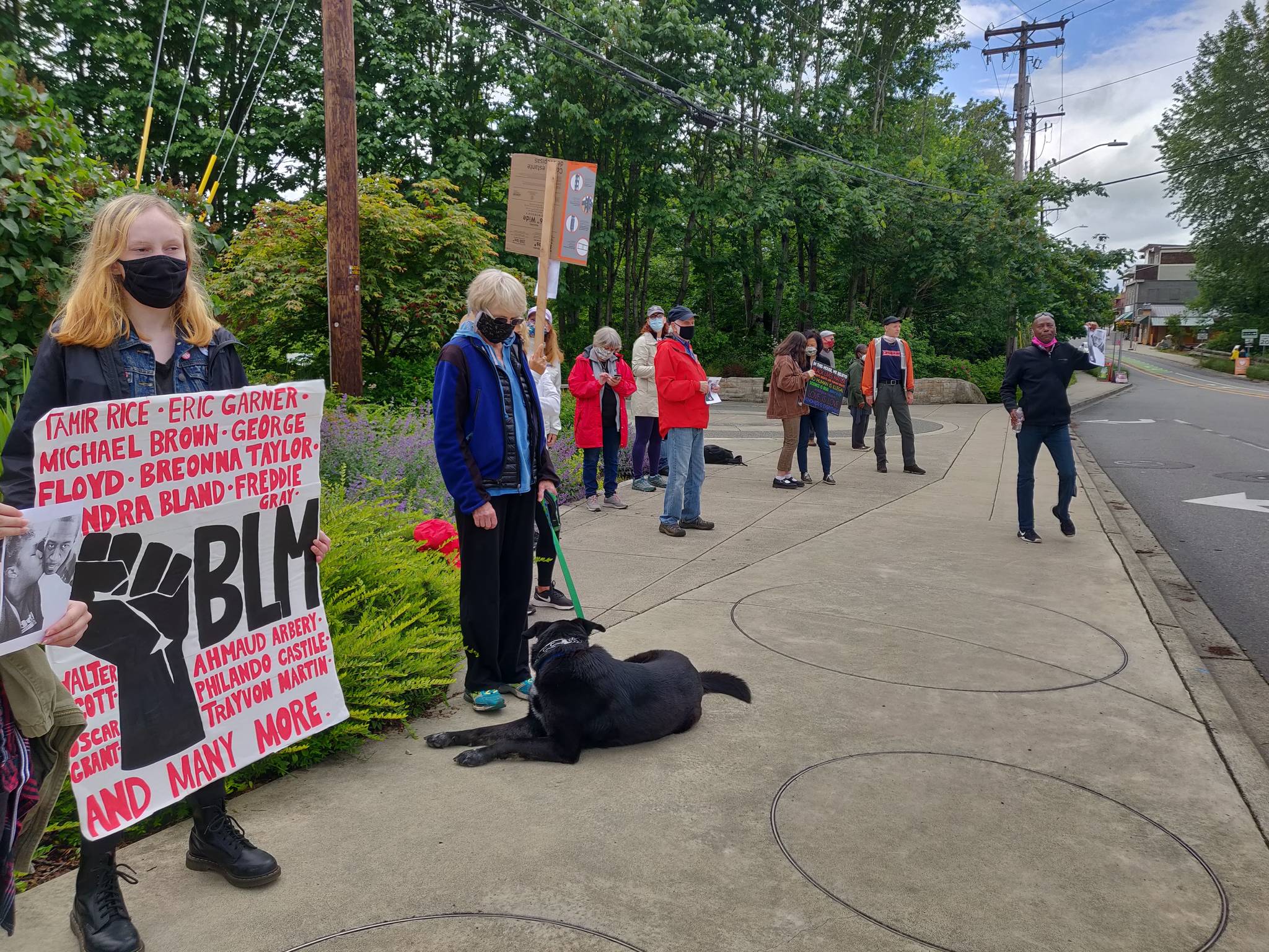 “Seattle is on its second day of curfew at 5 p.m. and people on Bainbridge Island are also protesting the death,” said Holly Brewer of Indivisible Bainbridge Island, referring to Seattle Mayor Jenny Durkan’s imposing a curfew on the city in light of vandalism and looting during protests there.