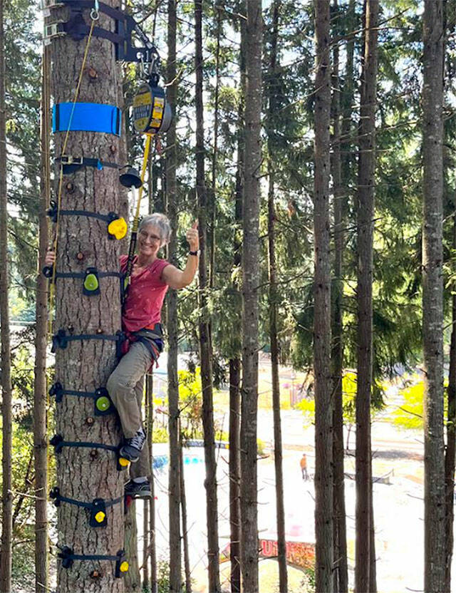 On the way up the tree, climbers will pass by milestones signifying their progress. At 20 feet there’s a green strap, at 30 feet a red one, at 40 feet there’s a gold strap, and at the top is a bell to ring. Schwarcz said many people have made it to the top, ranging from a 5-year-old to a 66-year-old.