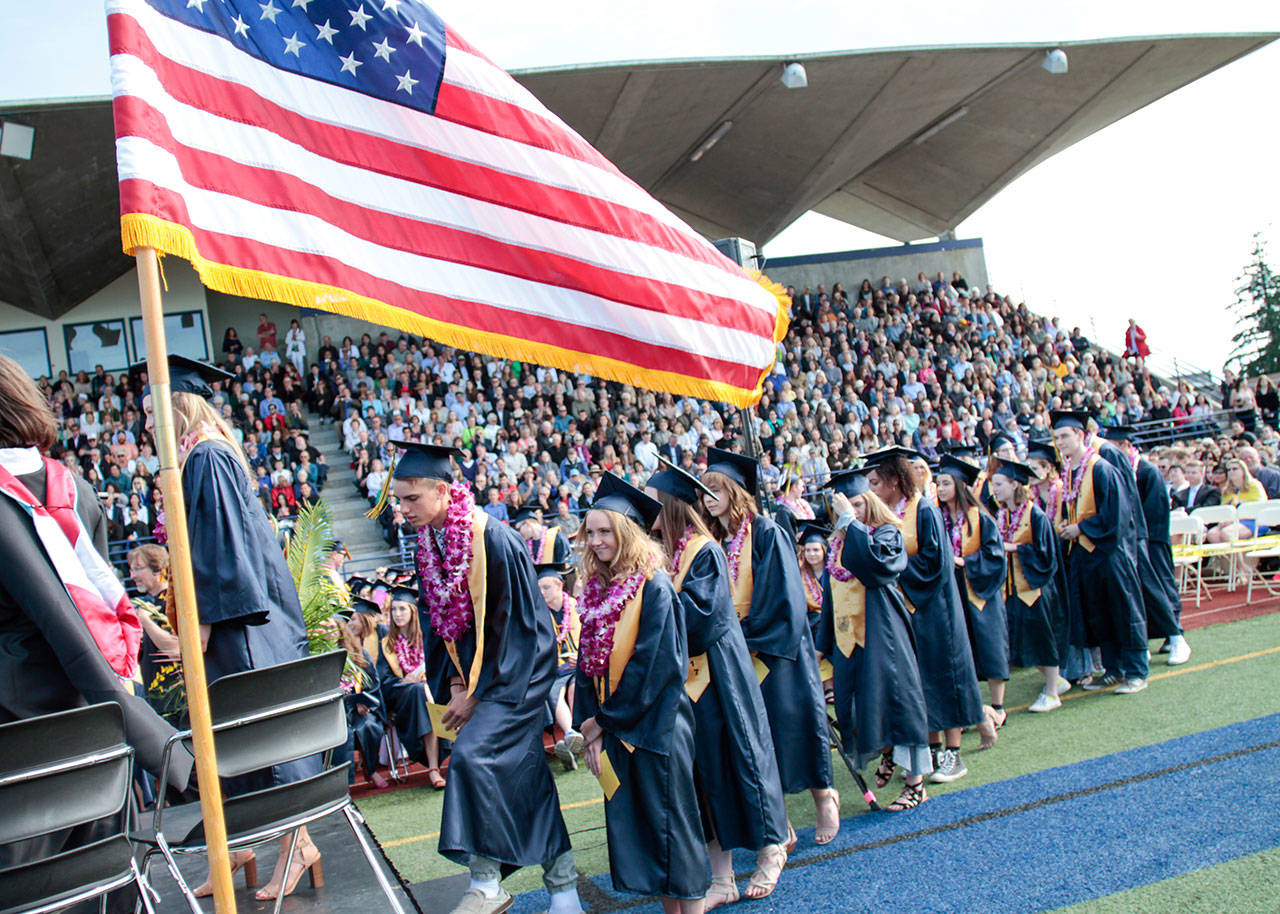 Spirits were high during the Class of 2017’s Commencement Ceremony for Bainbridge and Eagle Harbor highs, and even though some rather ominous-looking weather threatened to soak their gowns Saturday, it was clear that no amount of rain could possibly capsize these Spartan spirits on their special day.