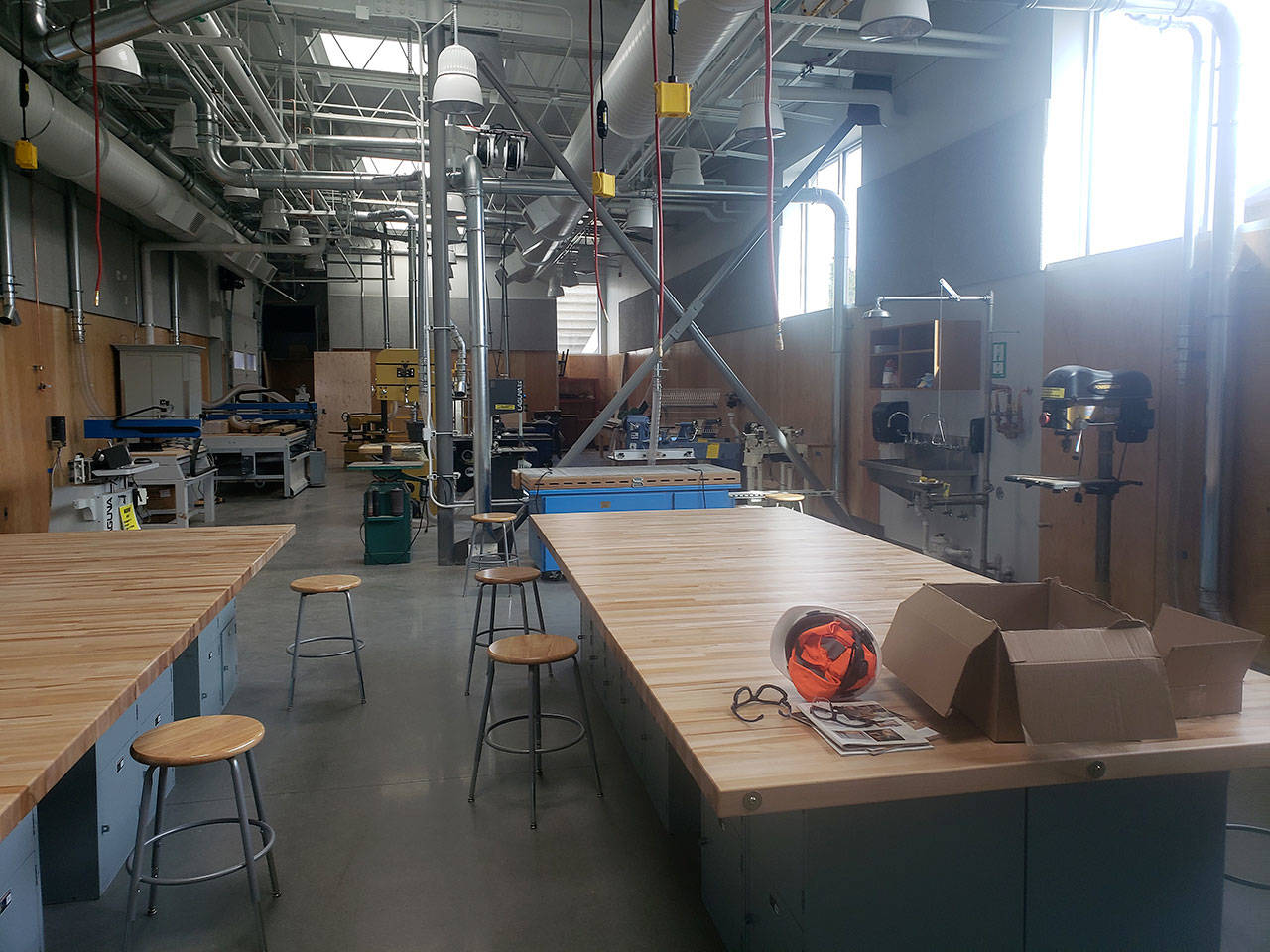 All classes open into common spaces, which are adjacent to the kitchen servery and the industrial arts environment. Classrooms and instructional spaces in the building consist of labs for composites, metal, culinary arts, drafting, and 2D and 3D art, along with woodshop and music rooms.