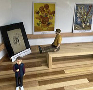 Other things inside the gallery are furniture and stands to put artwork on. He put small postcards of Monet’s paintings in there at the start to “get the point across of what it’s for.”