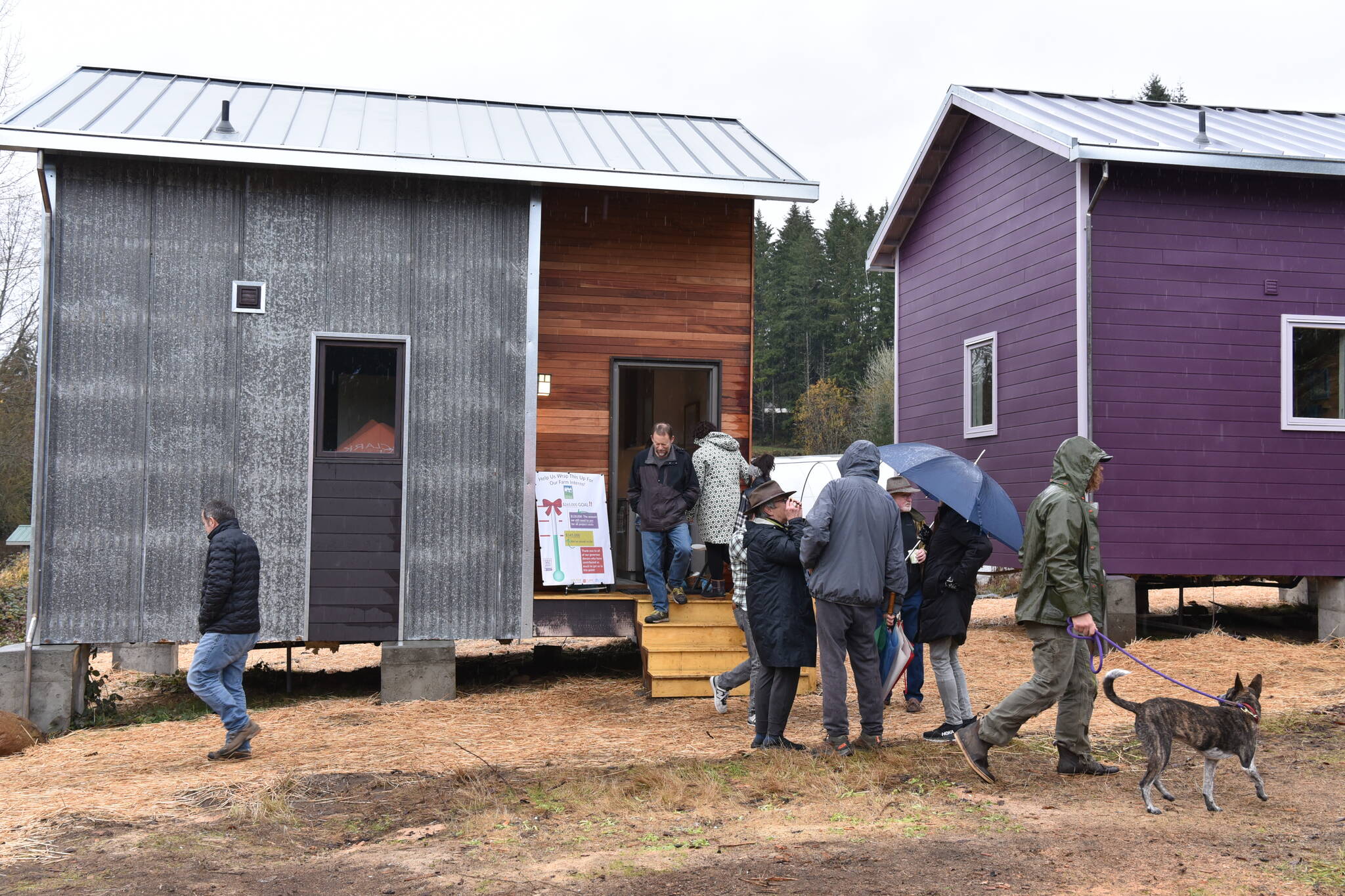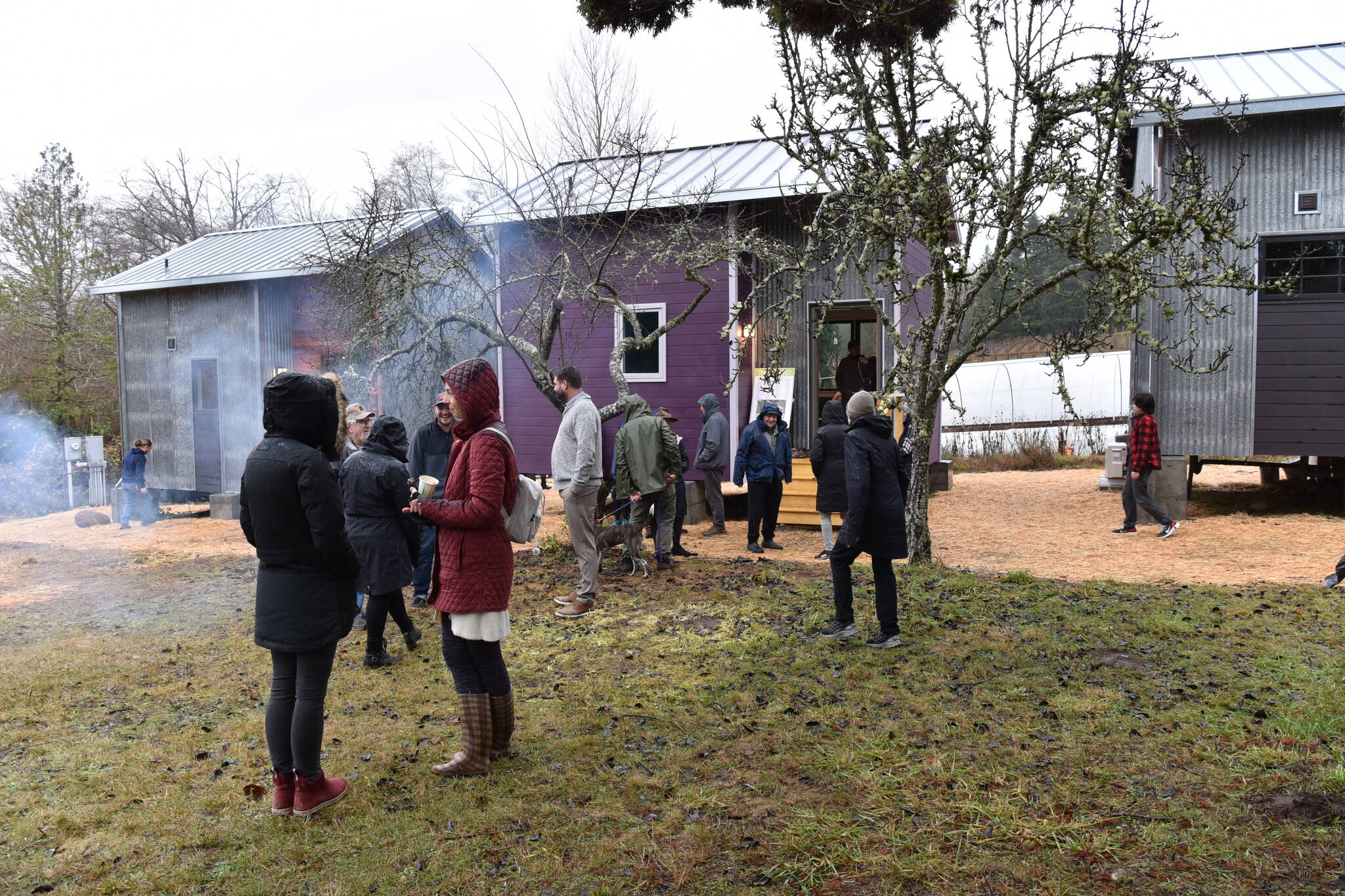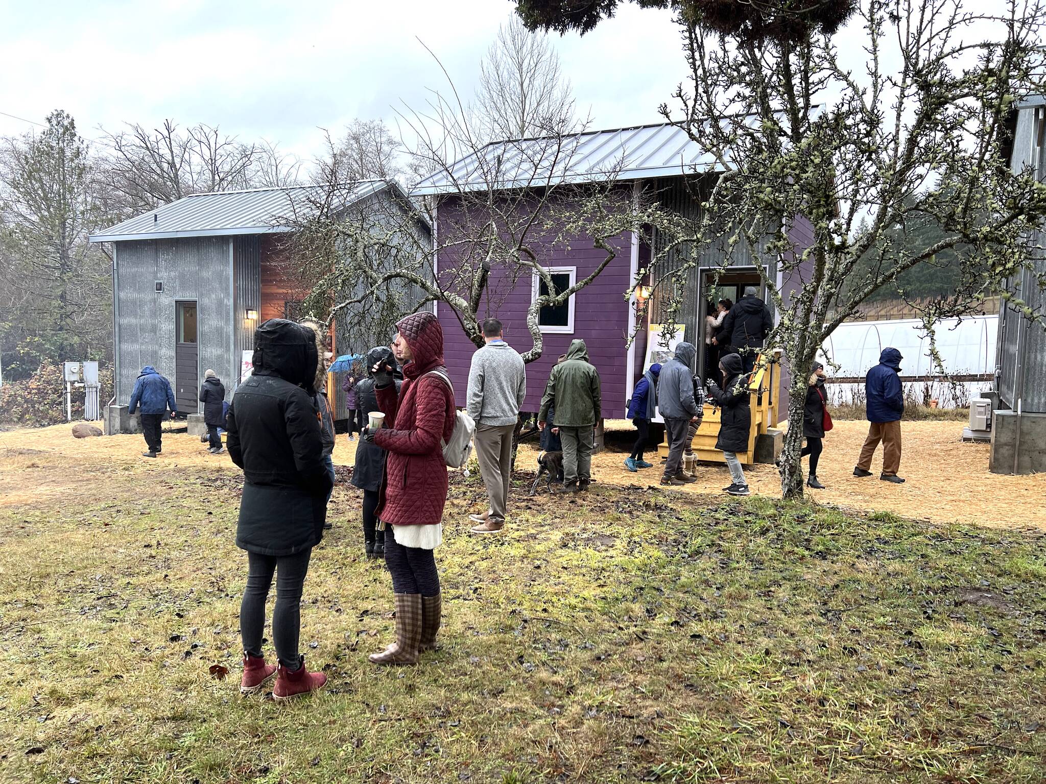 Volunteers and partners visit the Morales Farm to view the tiny homes that the community of Bainbridge Island built.