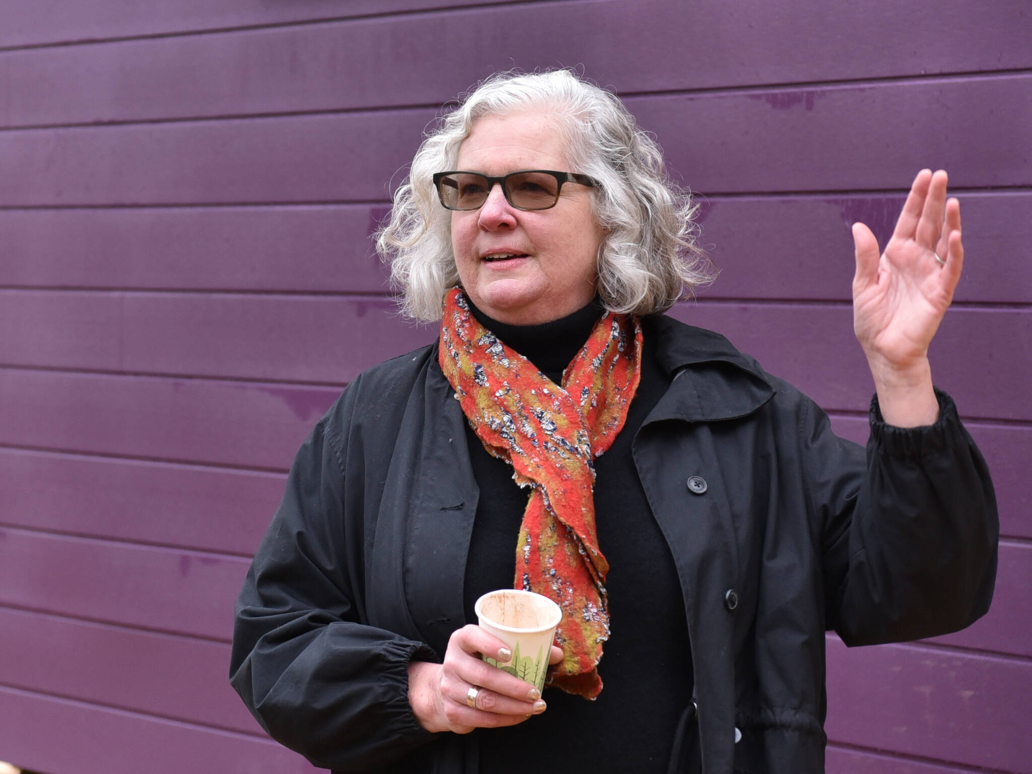 Heather Berger, executive director for Friends of the Farms, speaks with visitors during the Tiny Homes open house Dec. 10 at the Morales Farm.