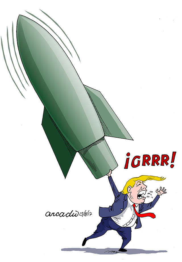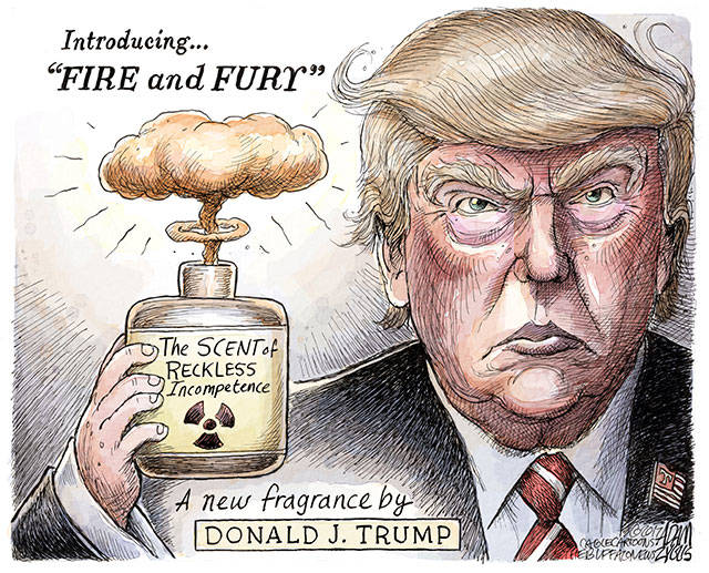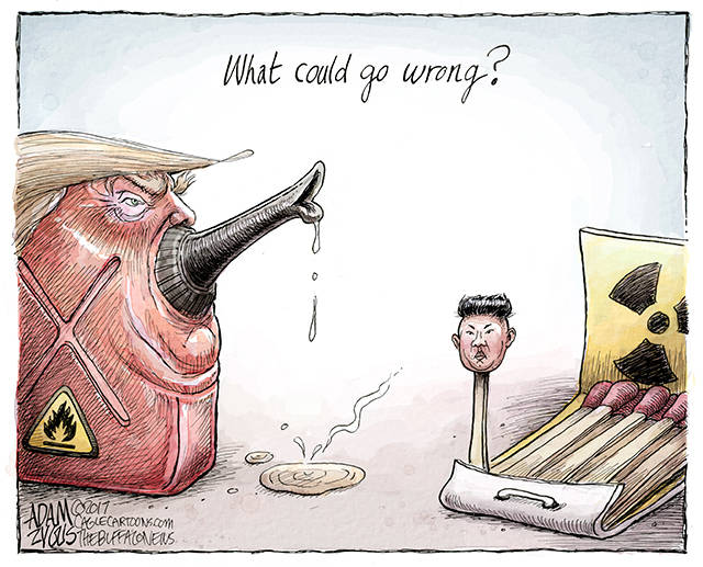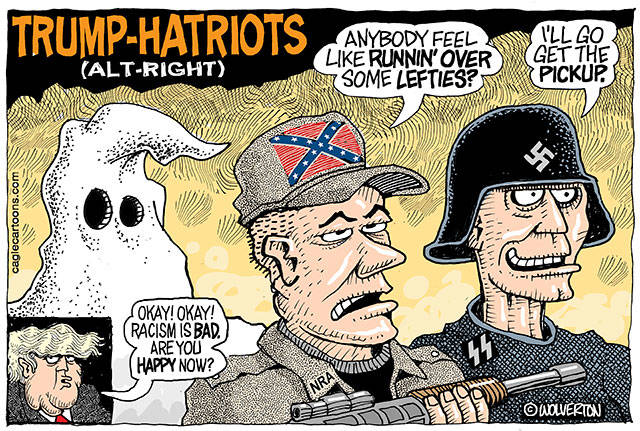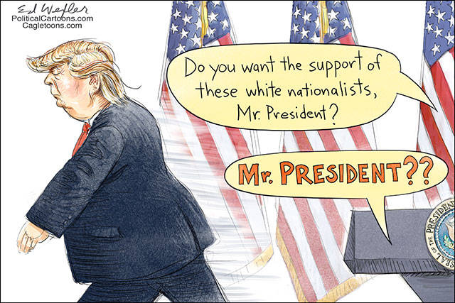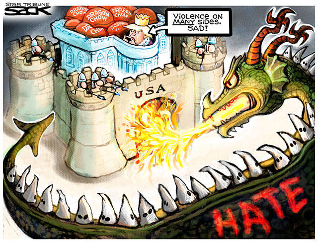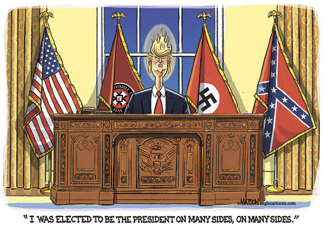 Lost, for much of the past seven days, was the continuing controversy over Russian meddling in the 2016 Presidential Election. Or any thing else, for that matter. Cartoonists across the country turned from inking opinions on the North Korea-U.S. standoff to the president’s much-panned response to the disgusting display of hate and bigotry over the weekend.