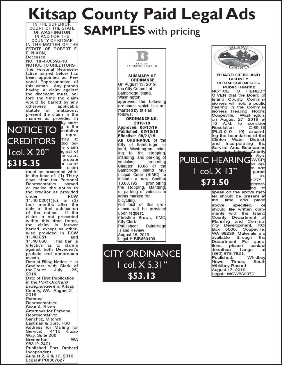 Note that all Kitsap newspapers publish once per week every Friday. The deadline to submit legals is 2:00 p.m. the Friday 7 days prior to publication date. For the Kitsap Countywide option, the deadline is also the Friday’s at 2:00 p.m. 7 days prior to publication.