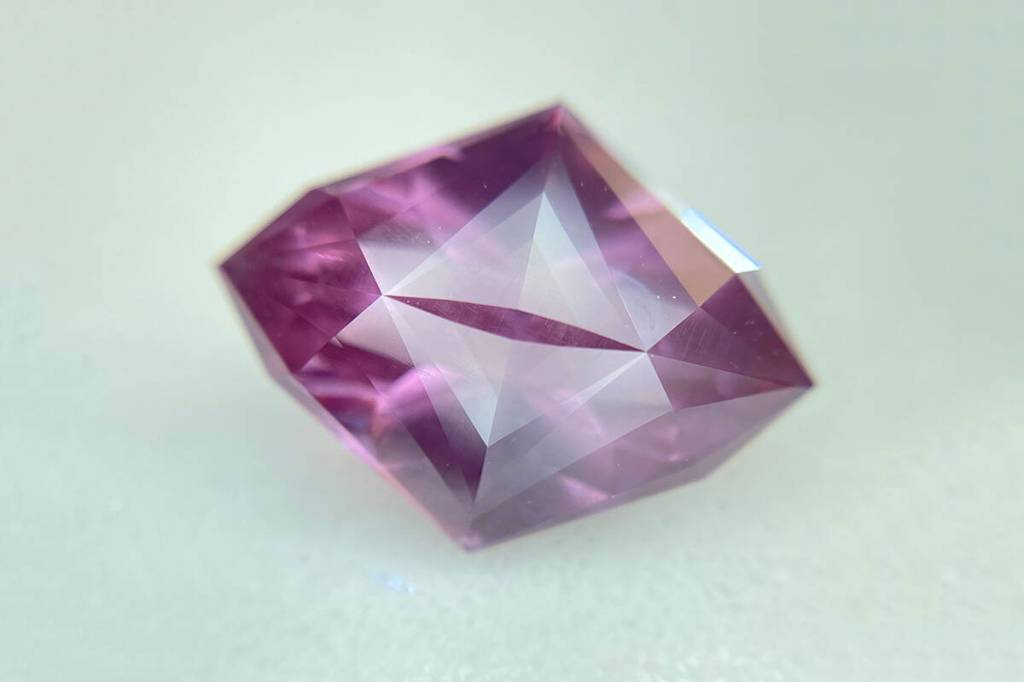 “What you typically see in the jewelry store is a dark red gem. But now we’ve found garnets in almost every color: mint, yellow, color-changing purple, fuschia, and a lot more,” Callahan says. “Different light affects different components within Dragon Garnet, so it can go from pink to peach, hot pink, neon pink, and even fluorescent pink.”