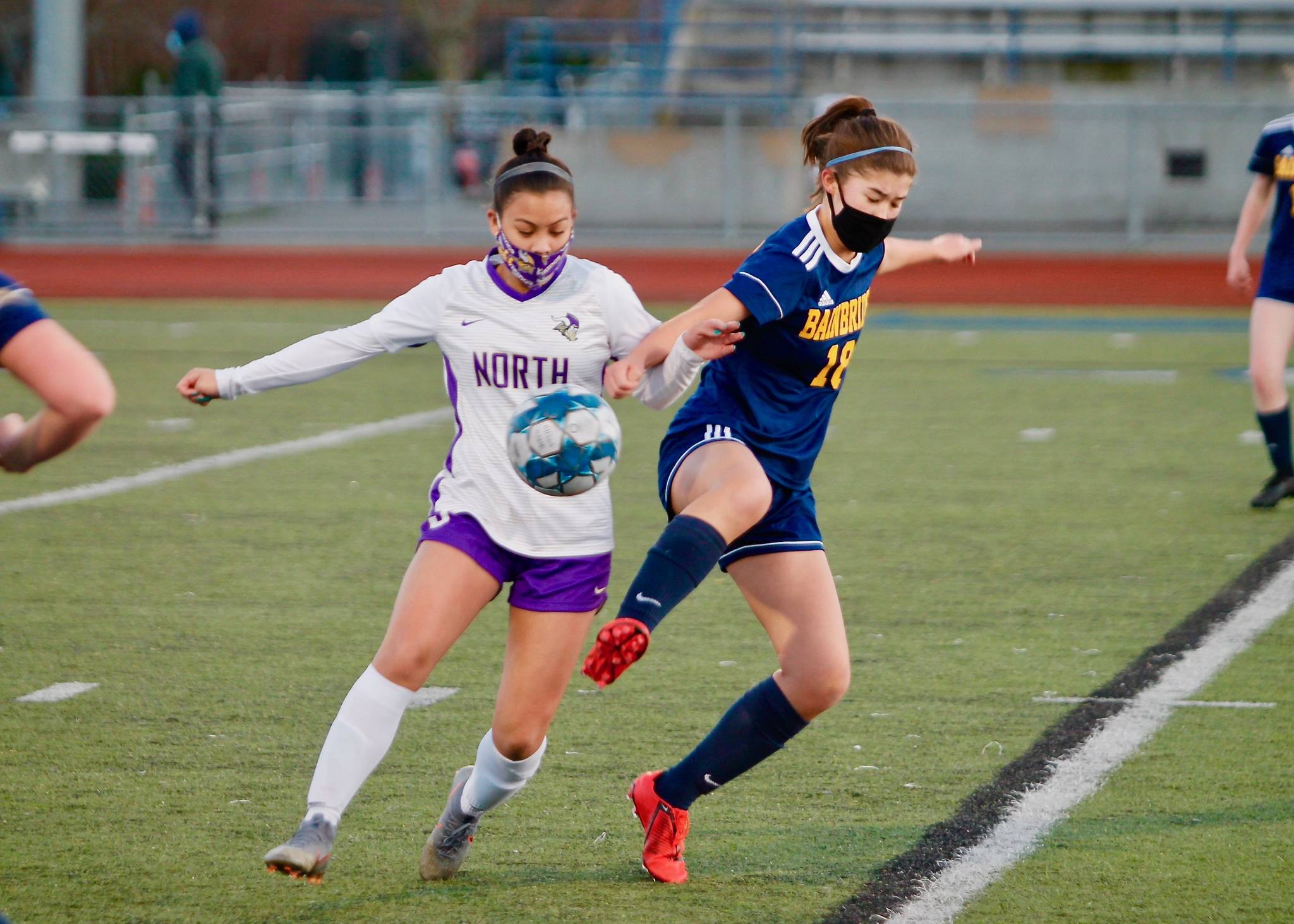 Late in the first half, Bainbridge had another golden opportunity. A shot from Ellen Murray was blocked, and Gabby Weis chased down the rebound and sent another cross in to Murray, who had a clean look at the net and tried to go above the keeper with the shot. North Kitsap’s Nicole Rosen got her hands on it and sent it over the crossbar.