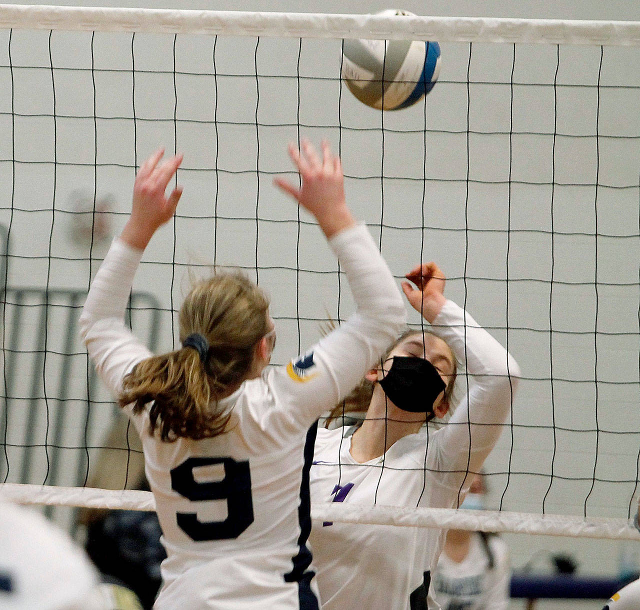 North Kitsap hitter Lillian Pruden battles at the net with Bainbridge’s Lauren de Gall (9). (Mark Krulish/Kitsap News Group)