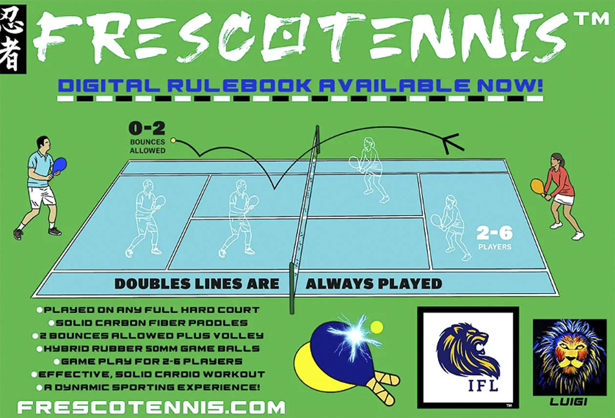 Frescotennis brands itself as “The Future of Dynamic Rally Sport.” It’s an alternative paddle sport for two to six players competing on a tennis court. It includes strategy, sprinting, cardio, teamwork and core fitness training. It’s played with handmade Brazilian fiberglass and carbon fiber paddles, along with high-velocity 50mm rubber balls.
