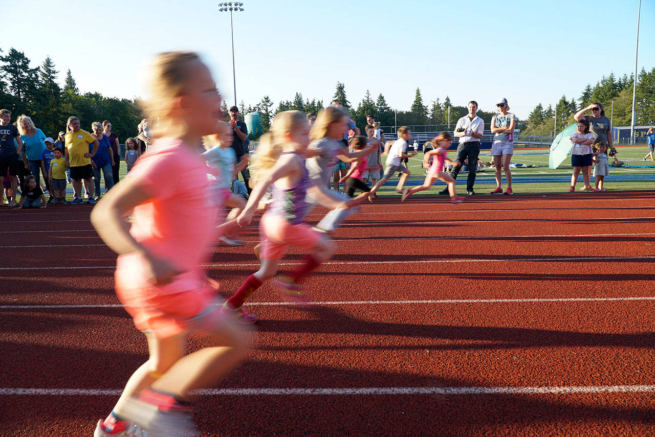 More than 150 children have participated in each of the six weeks of this year’s Kiwanis All- Comers Track Meet season, plus more than 30 jogger’s milers of all ages, with many more dozens of parents, grandparents, and friends lining the track to cheer.