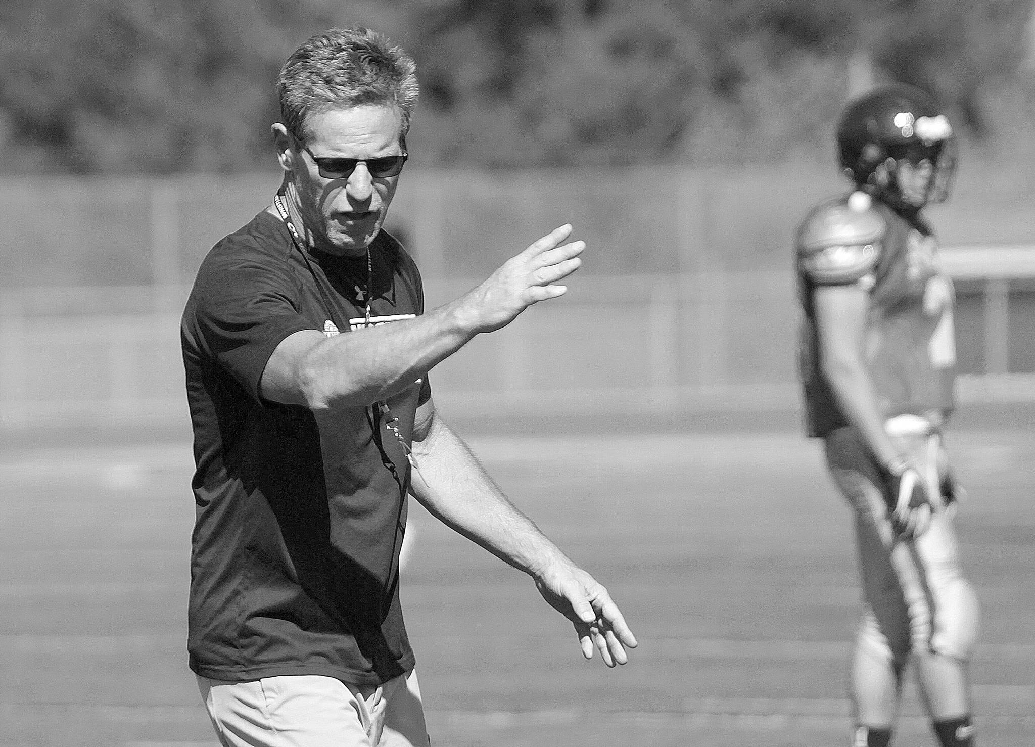 Luciano Marano | Bainbridge Island Review - Bainbridge High School varsity football Head Head Coach Jeff Rouser, seen here during a practice session earlier this season, led the Spartans to a 4-4 year that was cut short Saturday with a 28-7 first-round playoff loss to Rainier Beach on the road.                                 Luciano Marano | Bainbridge Island Review - Bainbridge High School varsity football Head Head Coach Jeff Rouser, seen here during a practice session earlier this season, led the Spartans to a 4-4 year that was cut short Saturday with a 28-7 first-round playoff loss to Rainier Beach on the road.
