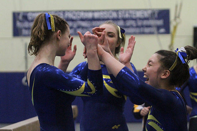 The Bainbridge Spartans won beat Holy Names and Ballard in their final home gymnastics meet of the regular season, and also gave Senior Night honors to Emma Chee, Alathea Pippinger and Tate Goff.