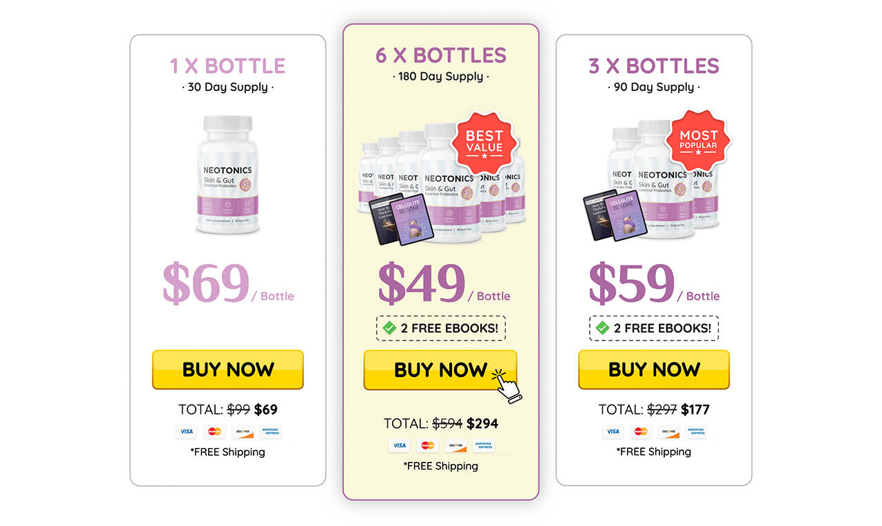 Neotonics is priced at $49 to $69 per bottle. The more bottles you order, the more you save on each bottle. The ordinary retail price of Neotonics is $99 per bottle, and you can save significantly by ordering directly from the manufacturer.